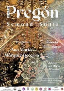 En esta edición, la responsabilidad y el honor de exaltar nuestra Semana Santa ha recaído en Ana María Márquez Becerra. Desde La Filarmónica, queremos trasladarle nuestra más sincera enhorabuena. Su reconocido compromiso con la Iglesia será, sin duda, la mejor batuta para dirigir unas palabras que nos adentrarán en el verdadero sentido cristiano de estos días.